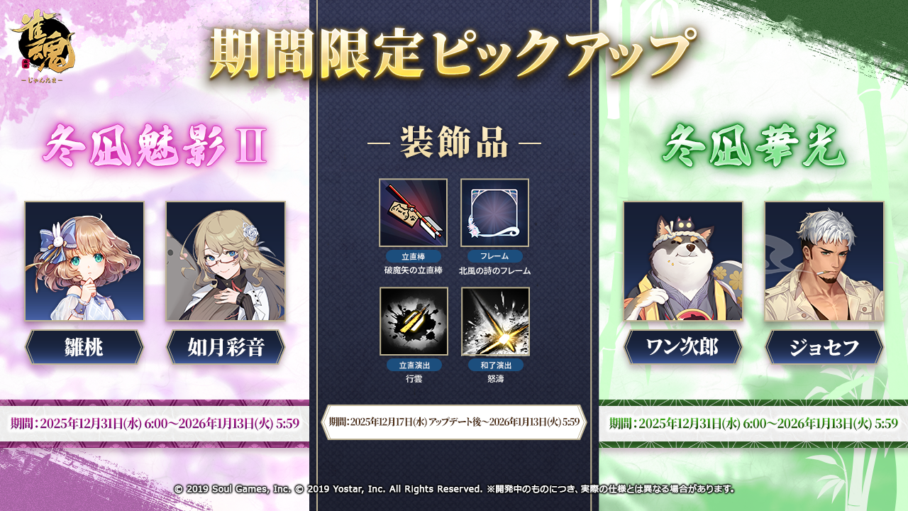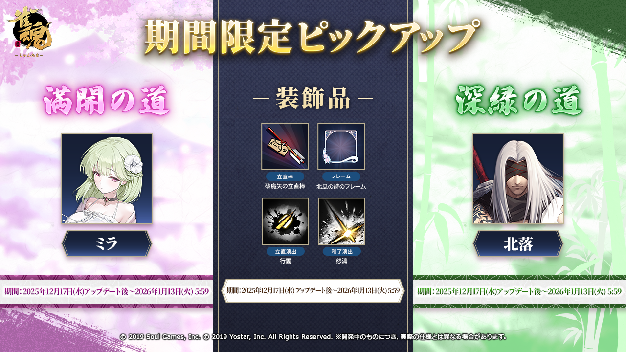 『満開の道』『深緑の道』『冬凪魅影 I』『冬凪魅影 II』『冬凪華光』のピックアップは、新雀士を含めた特定雀士や新期間限定装飾品の出現確率が期間限定でアップ。
