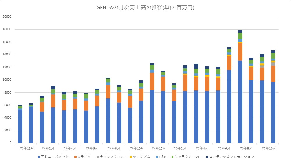 GENDA<9166>は、この日(12月17日)、2025年11月度のGENDA売上進捗レポートを公開し、2025年11月度の月次売上高(合計)は前年同月比48.3%増の147億2400万円と大幅な成長を達成したことを明らかにした。累計売上高(合計)は同53.4%増の1343億3300万円だった。主力のエンタメ・プラットフォーム事業の売上高が同49.6%増の133億8400万円とけん引した。内訳は、アミューズメントが同44.0%増の96億9300万円、カラオケが同36.8%増の25億6400万円と伸びた。国内アミューズメント施設の既存店売上成長率は曜日調整後で106%と好調を維持した。