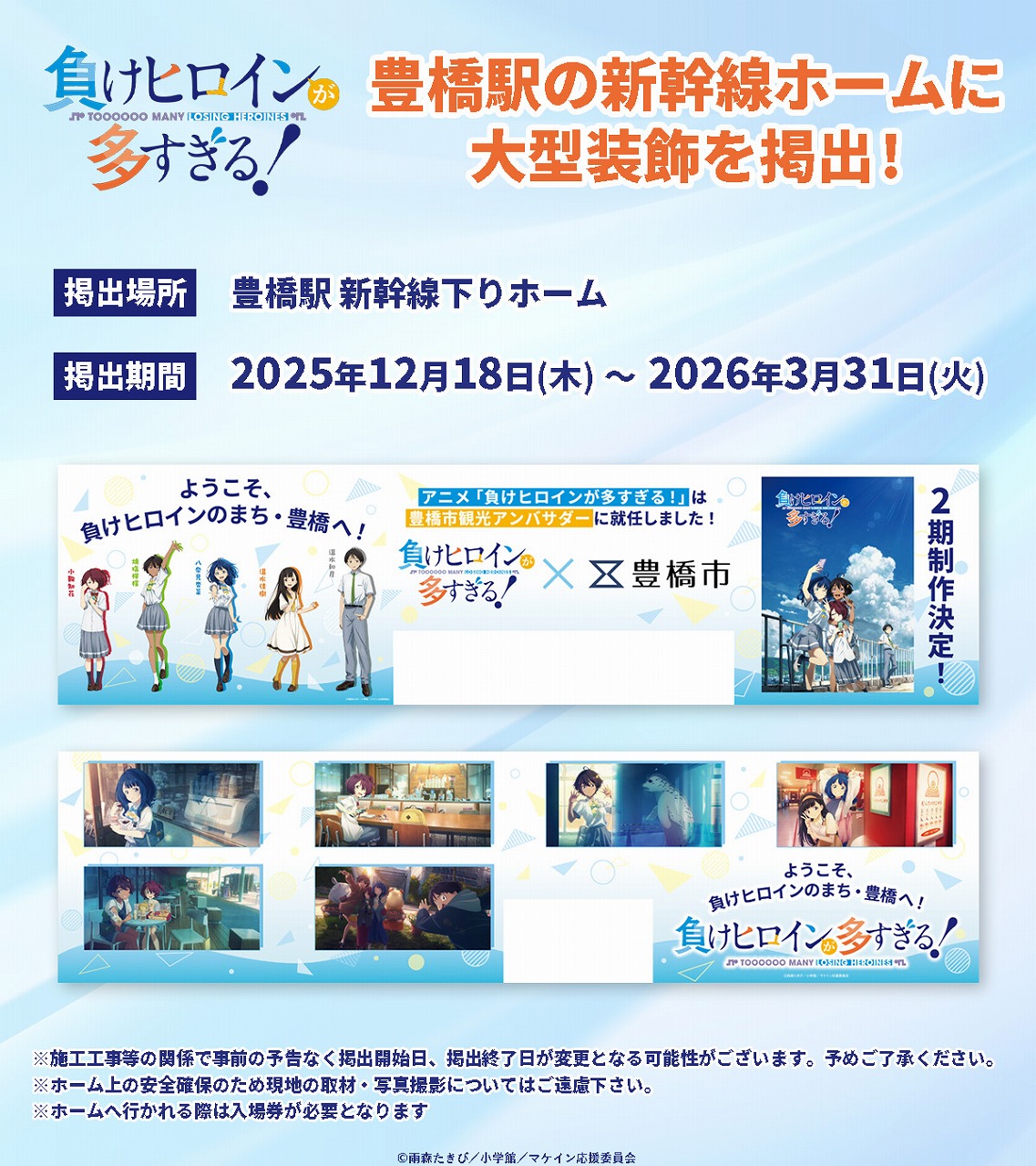 アニプレックスは、アニメ「負けヒロインが多すぎる!」は作品の舞台である愛知県豊橋市より豊橋観光アンバサダーとして委嘱を受け、「とよはし青春アンバサダー」に就任したことを明らかにした。2024年6月に市から「豊橋応援隊」として公認され、アニメの放送など活動を行ってきたが、今回のアンバサダー就任を期に、より一層豊橋を盛り上げていくとしている。