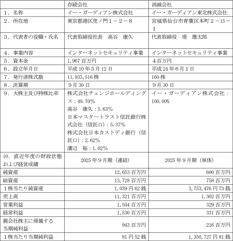 イー・ガーディアン<6050>は、この日(11月17日)、完全子会社であるイー・ガーディアン東北を2026年4月1日付で吸収合併することを決定した。イー・ガーディアンを存続会社とし、イー・ガーディアン東北は解散する。