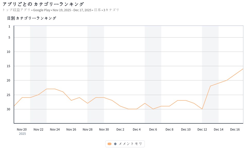 また、バンク・オブ・イノベーション(BOI)<4393>の『メメントモリ』が16位までじりじりと順位を上げてきている。『メメントモリ』は、12月11日より、「聖夜祭」第二弾を開催しており、その中で新キャラクター「[聖なる漆黒の輝く星]ステラ」が出現するピックアップガチャを実施していることなどが今回の順位上昇の起点となっているもよう。
