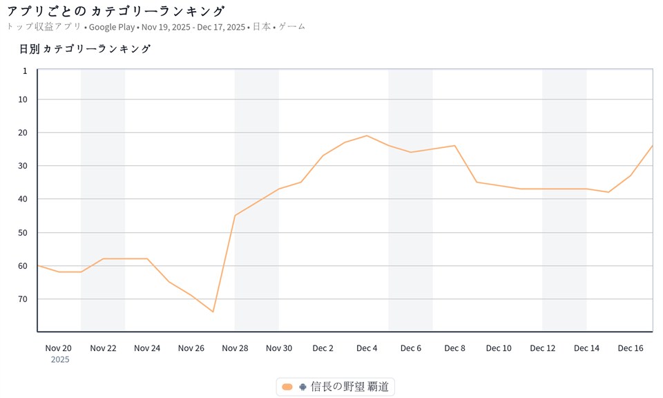 ランキングの動きで目立ったのは、前日の33位から24位へと順位を上げたコーエーテクモゲームスの『信長の野望 覇道』だ。『信長の野望 覇道』は、3周年キャンペーン武将として、UR「羽柴秀吉(千成衾・真)」が12月15日より登場していることが足元の売上につながっているようだ。