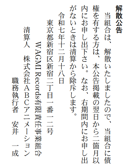 WAGMI Records有限責任事業組合(WAGMI Records LLP)が解散したことがわかった。本日12月18日付の「官報」に掲載された「解散公告」で判明した。