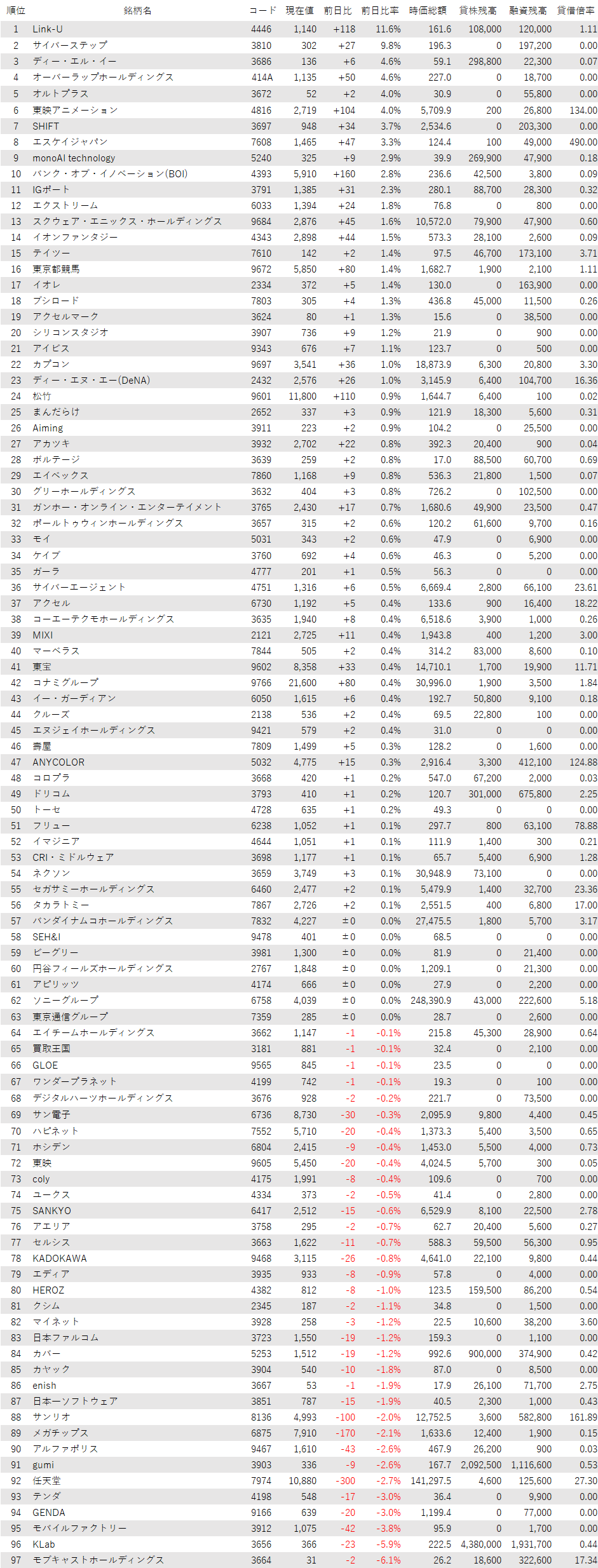 こうしたなか、ゲーム・エンタメ関連企業をみると、登録されている97銘柄のうち、上昇は56銘柄(58%)、下落は34銘柄(35%)、変わらずは7銘柄(7%)で、買い優勢だった。