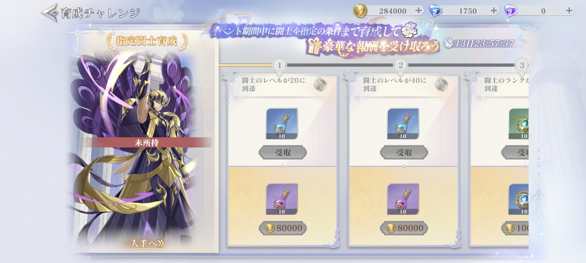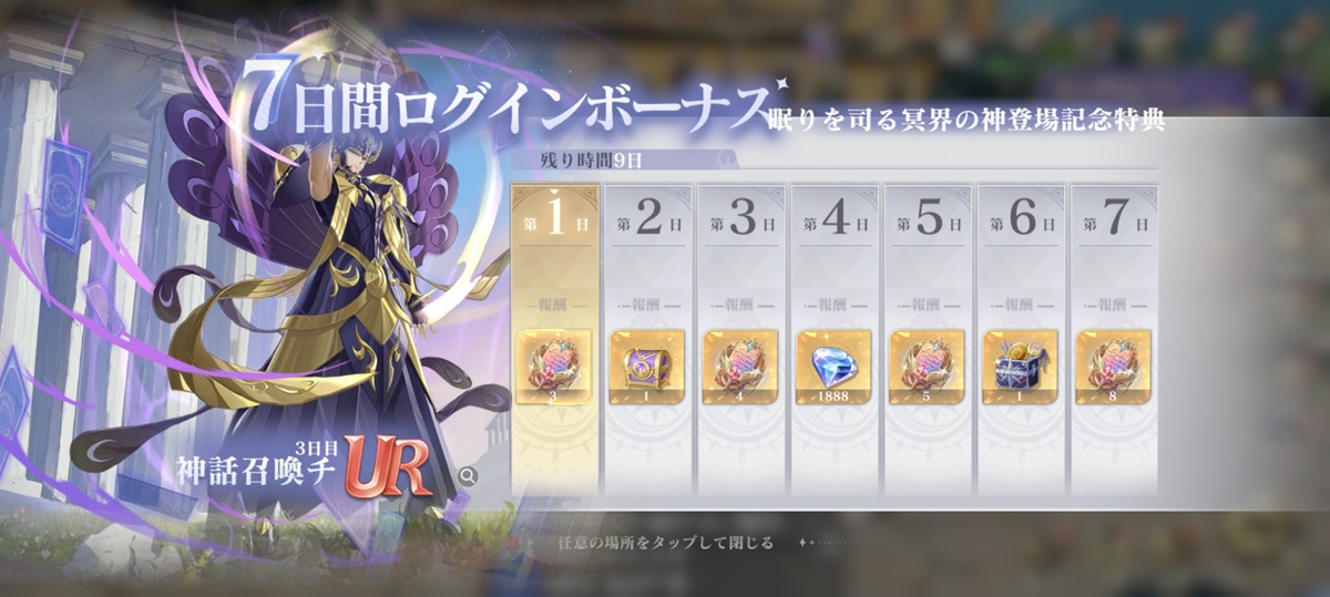 イベント期間中、闘士「眠りを司る神・ヒュプノス」を指定の条件まで育成すると、豪華報酬を受け取れる。