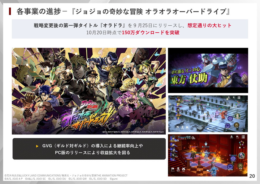 売上急回復の要因は、新作モバイルオンラインゲーム『ジョジョの奇妙な冒険 オラオラオーバードライブ』(以下、オラドラ)のヒットがあげられる。気になるのは利益面だが、積極的な広告投資を行ったことから営業赤字となったものの、同社はこれを「将来成長に向けた戦略的な先行投資」と位置付けている。
