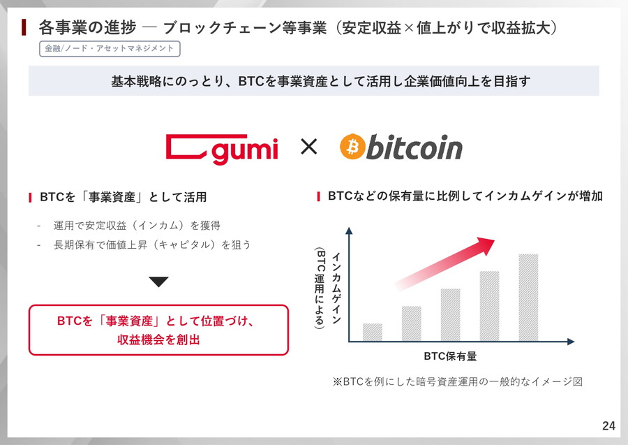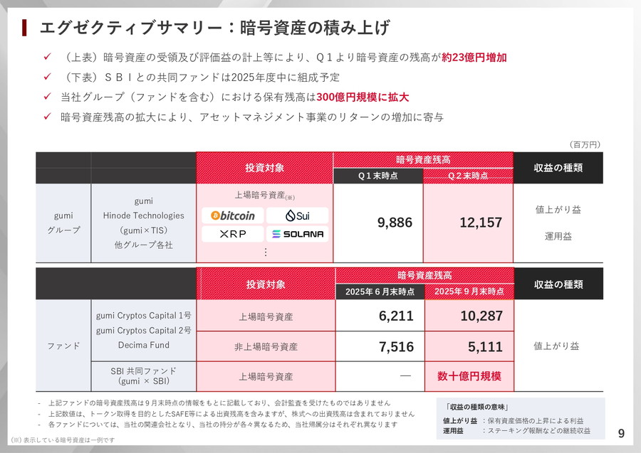 第2四半期末時点での暗号資産残高は、前四半期比で約23億円増加。ファンドを含むグループ全体では約300億円規模にまで拡大しており、前年同期比では177%増と大きく成長している。今後もBTCやXRPを戦略的に取得し、収益基盤の強化を図る方針だ。