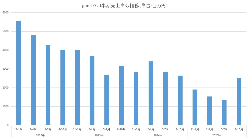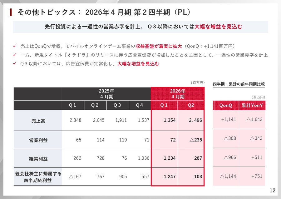 gumi<3903>は、2026年4月期第2四半期累計(中間期)の決算説明動画を公開した。モバイルオンラインゲームで不採算タイトルの早期撤退、一部タイトルの他社への運営移管、子会社エイリムの離脱などで売上を大きく減らしていたものの、第2四半期(25年8~10月)だけで見ると急激に売上が回復している。第1四半期の売上高は前年同期比で52.4%減と半分以下に落ち込んだが、第2四半期は同5%減となる水準まで戻した。