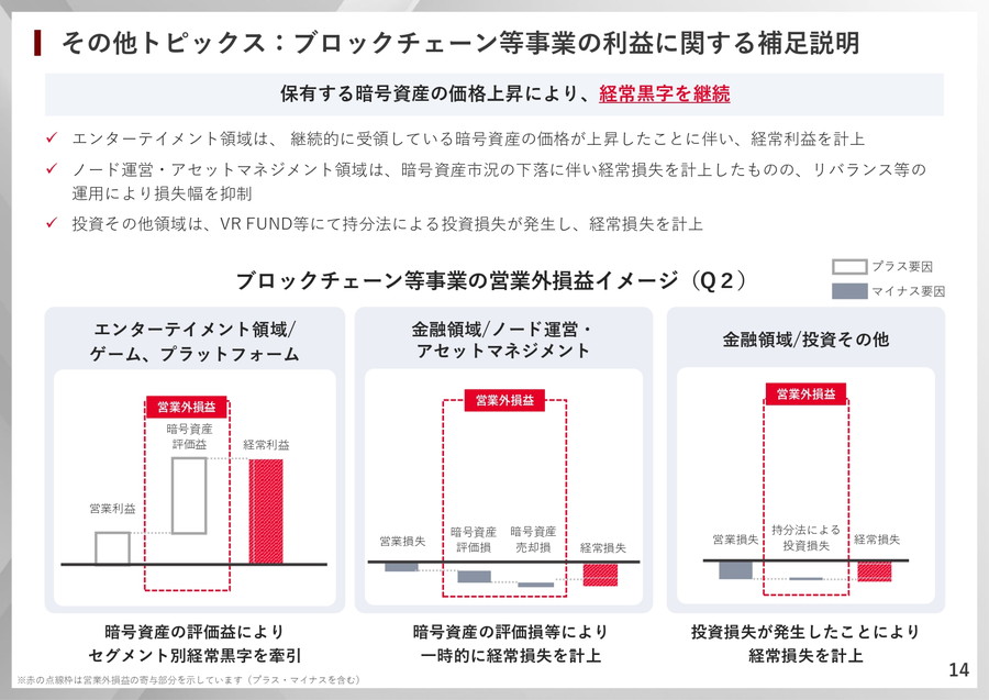 ゲーム事業に加え、ブロックチェーン事業を含む事業ポートフォリオの多角化が収益の下支えとなっている点も特徴だ。