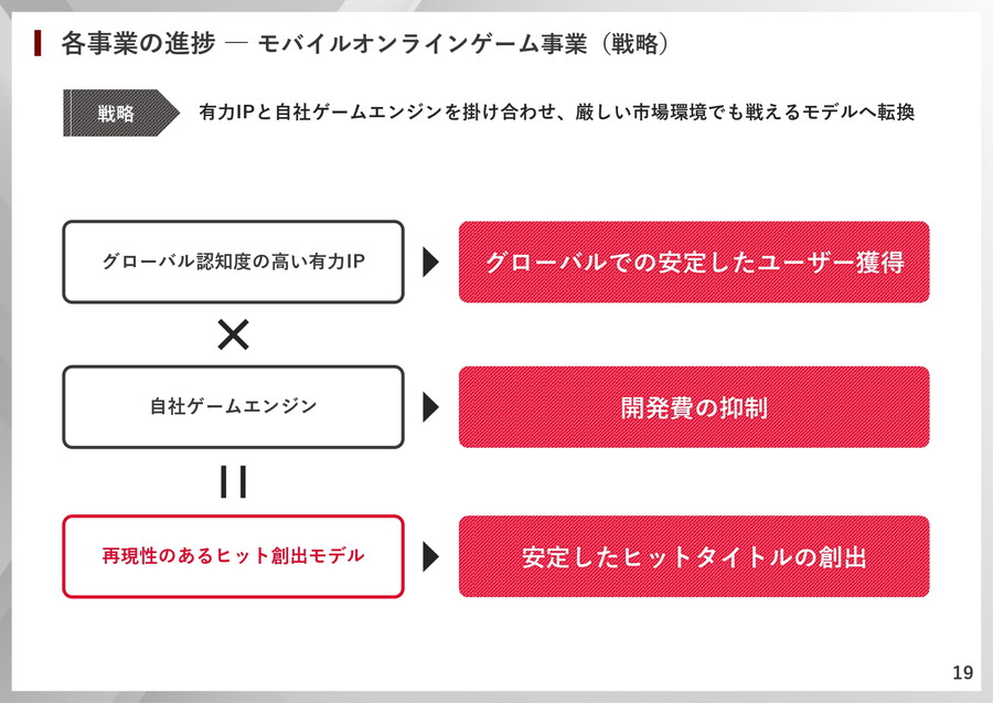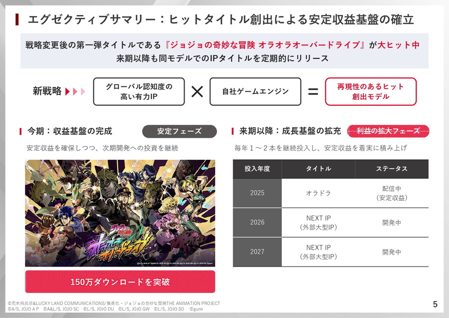 ゲーム事業においては、今後の成長戦略として「グローバルで認知度の高い有力IP」と「自社ゲームエンジン」を掛け合わせる新たな事業モデルへの転換を進めている。『オラドラ』はその第一弾であり、ヒットにより戦略の有効性を示した形だ。