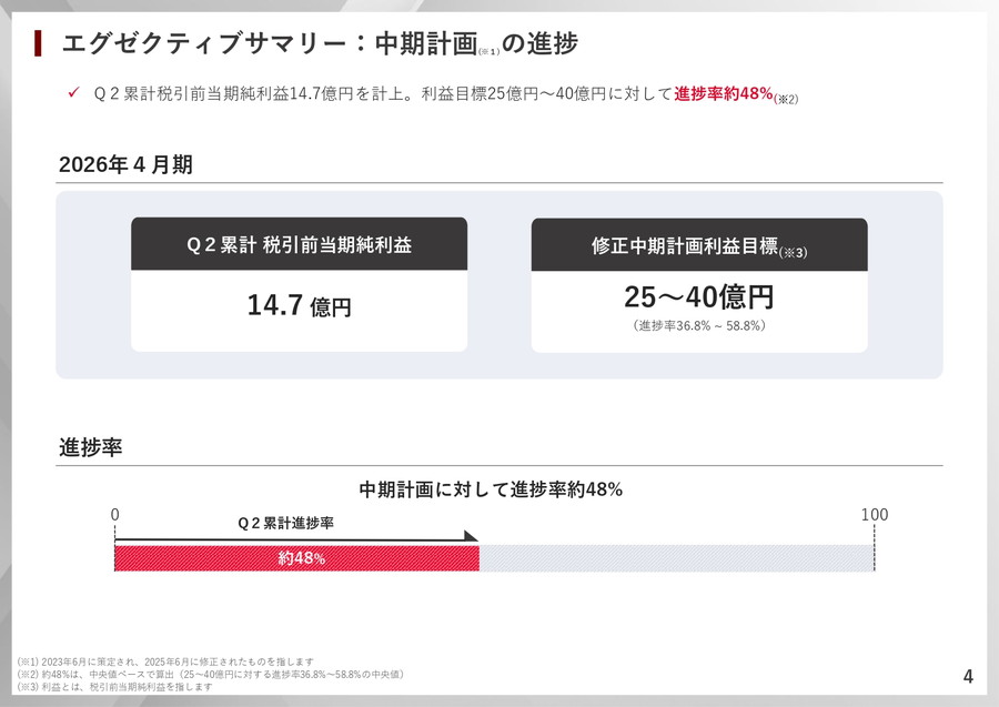 中期計画の進捗についても、順調な滑り出しを見せている。第2四半期終了時点での税引前利益は14億7000万円となり、通期目標である25億円~40億円に対して進捗率は約48%に達した。ここでも暗号資産の時価上昇による評価益が大きく貢献している。