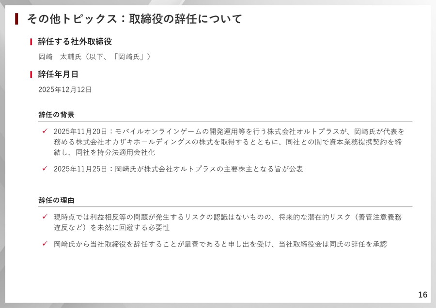 このほか、社外取締役の岡崎氏が2025年12月12日付で辞任することも発表となった。岡崎氏が代表を務める会社と、モバイルオンラインゲーム開発を行うオルトプラスとの資本業務提携に伴い、将来的な利益相反リスクを回避するための判断としている。