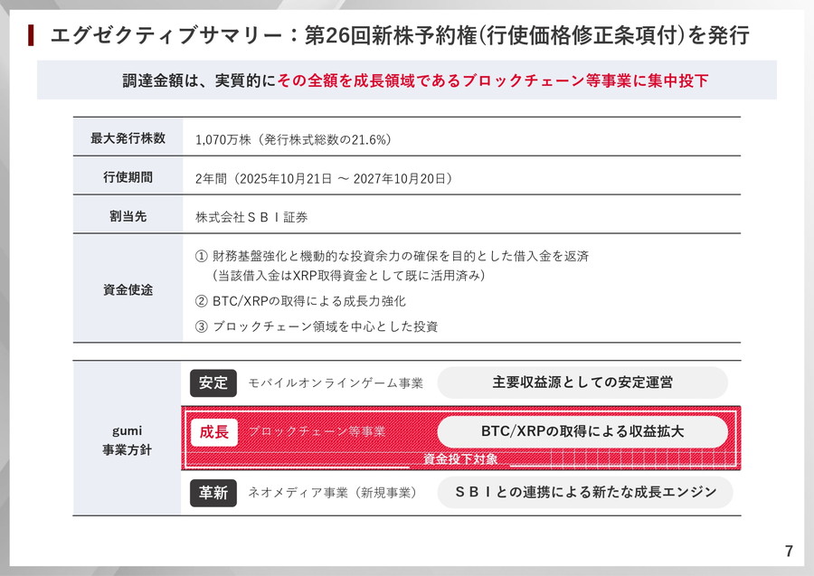 第26回 新株予約権の発行による資金調達については、調達資金のほぼ全額をブロックチェーン等の成長領域に集中投下する方針を示した。資金使途は、XRP取得に伴う借入金の返済、ビットコインやXRPの追加取得によるアセットマネジメント事業の強化、そして暗号資産ファンドやAI領域への戦略投資の3点だ。