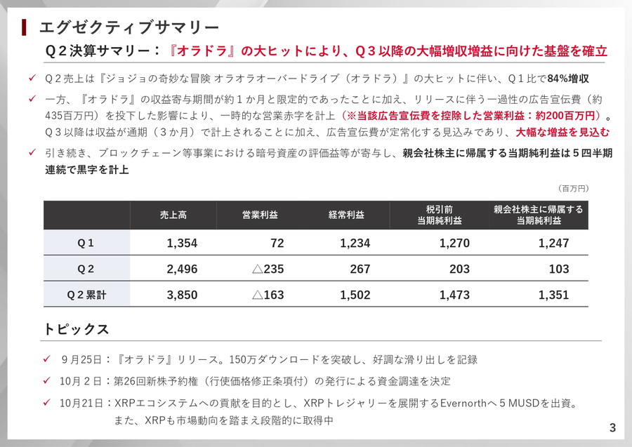 第3四半期以降は、『オラドラ』の収益が四半期を通して計上される見通しで、広告宣伝費も安定化することから、利益面での大幅な改善を見込んでいる。
