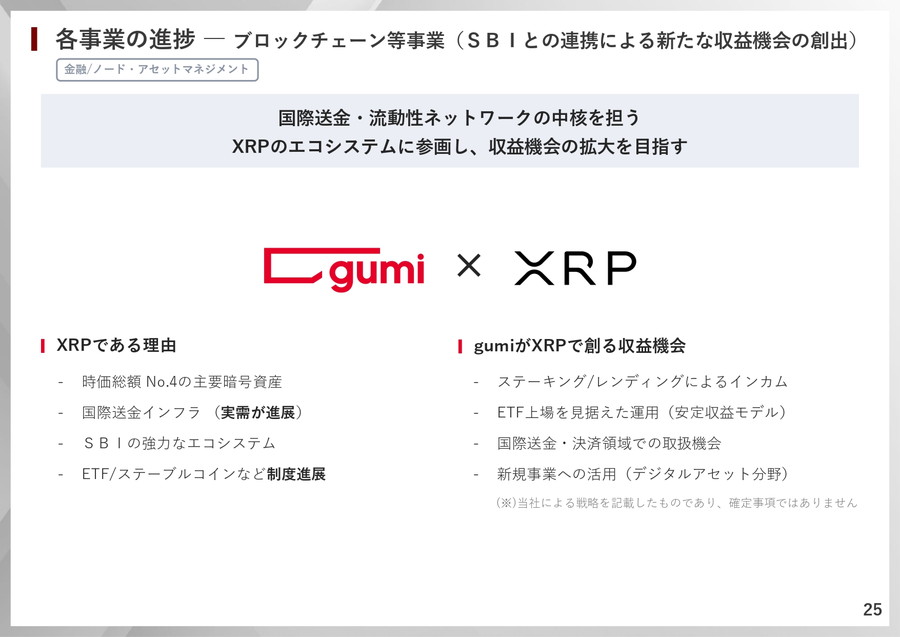 具体的な取り組みとして、2025年8月には25億円規模のXRP取得を決定し、段階的な取得を進めている。また、SBIグループとの連携を深め、プロ投資家向けXRPインフラを手掛けるEverth XRPトレジャリーへの出資も実施した。