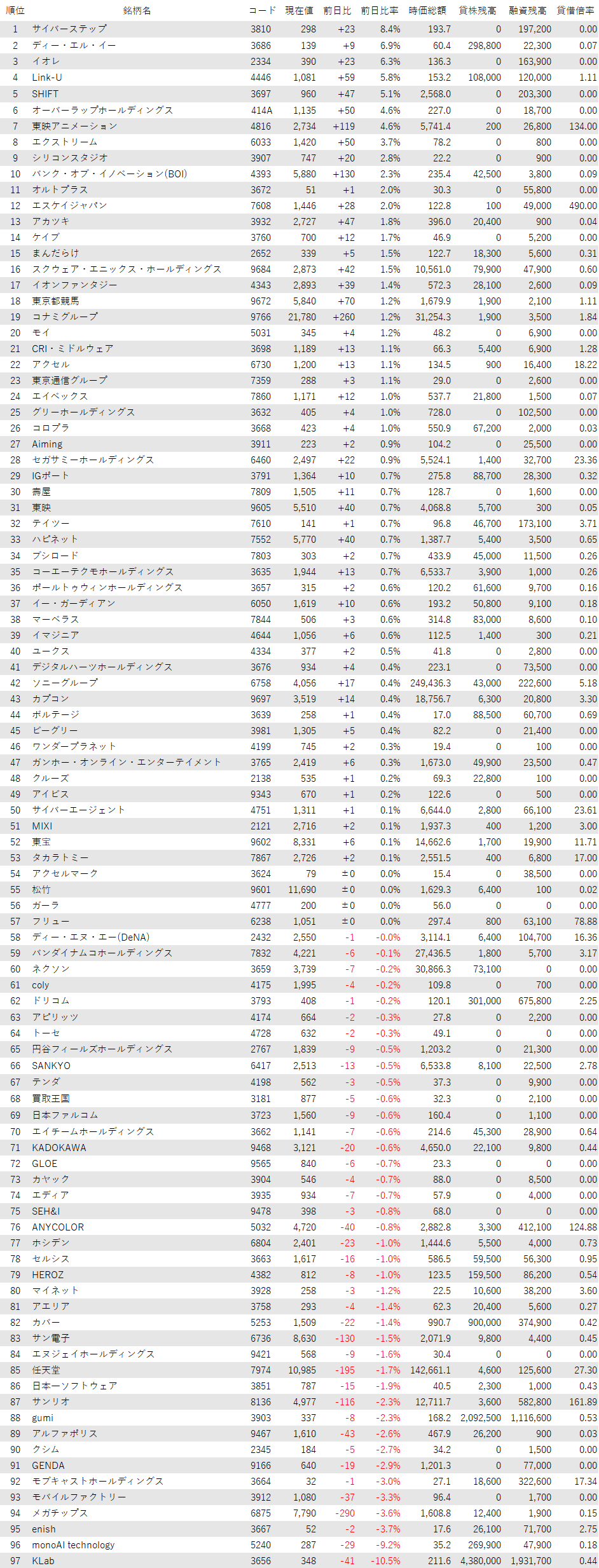 モバイルゲーム系の銘柄は、サイバーエージェント<4751>、MIXI<2121>、グリーHD<3632>、ガンホー<3765>、アカツキ<3932>、コロプラ<3668>、ケイブ<3760>が高く、DeNA<2432>、モバイルファクトリー<3912>が安い。