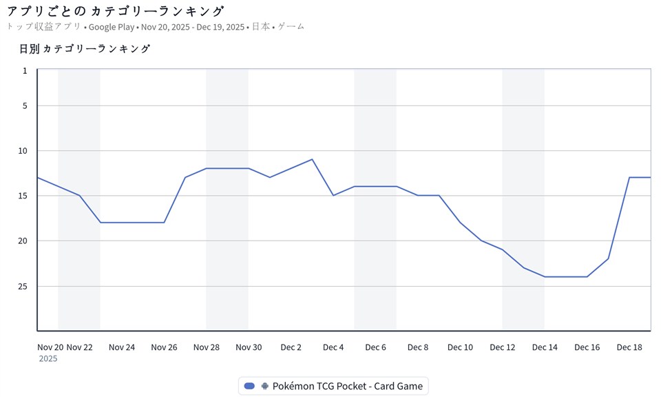 | 13 | ↑9 | Pokémon TCG Pocket | ポケモン/ディー・エヌ・エー(DeNA)<2432> |