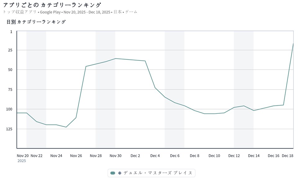 また、タカラトミー<7867>の『デュエル・マスターズ プレイス』が前日の95位から17位へと急浮上してきた。『デュエプレ』は、12月18日にリリース6周年を迎えたことを記念して、12月16日のメンテナンス終了後より、カードパック「LEGEND OF PLAY'S 2026」を発売するなど、6周年施策を展開していることが今回の順位上昇の原動力となっているもよう。