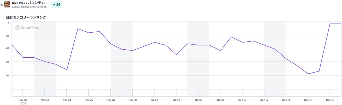 『バウンティラッシュ』は12月18日に、超レジェンダリーキャラ「"勝者島" トラファルガー・ロー」が参戦する【7thアニバーサリー】超バウンティフェスを開催しており、順位を押し上げる原動力となったもよう。