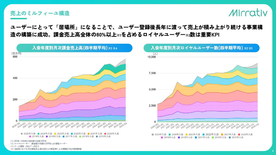 特徴的なのは、ユーザーにとってMirrativが「居場所」となることで、登録後も長期間にわたって課金が積み上がっていく点だ。同社はこれを「売上のミルフィーユ構造」と表現する。