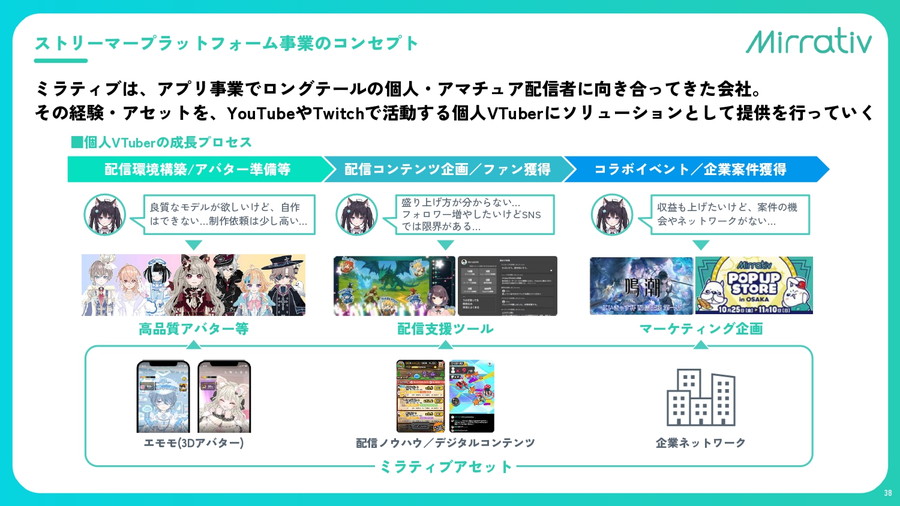 もう一つが、ストリーマープラットフォーム事業への本格投資である。同社は「All for Streamers」を掲げ、Mirrativで培った配信ノウハウやアセットを、YouTubeやTwitchなど外部プラットフォームで活動するVTuber・ストリーマー向けに提供する。