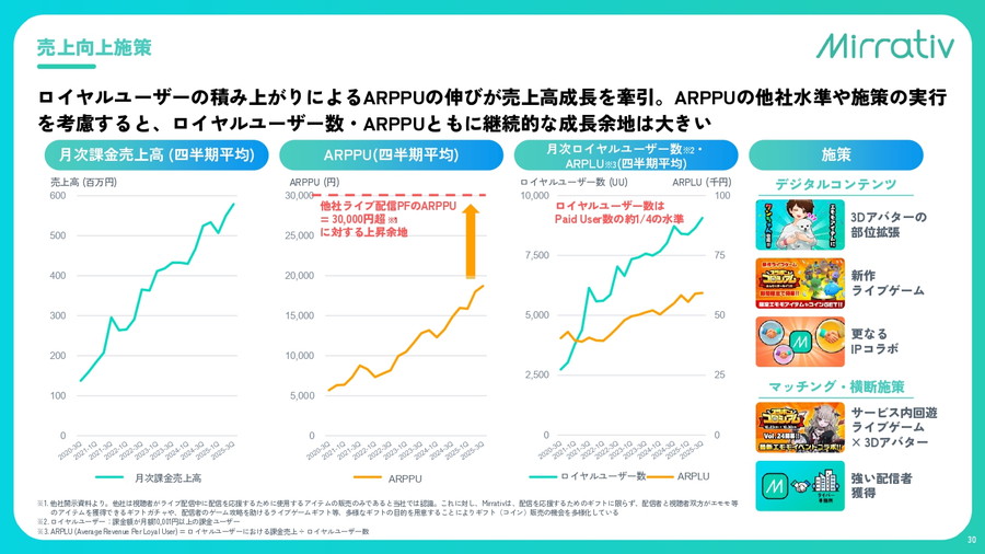 なかでも重要なKPIが、月額課金額1万円超の「ロイヤルユーザー」だ。ロイヤルユーザーは課金売上高の80%以上を占めており、人数の積み上がりとARPPU(ユーザー当たり平均課金額)の上昇が売上成長を牽引している。