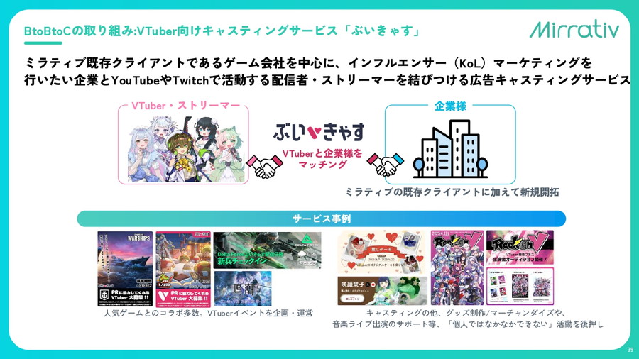 具体的には、企業とVTuberを結びつける広告キャスティングサービス「ぶいきゃす」や、VTuber向け配信支援ツール「CastCraft」を展開。CastCraftはすでに1万4,000人以上のアクティブ配信者を獲得しており、将来的には広告案件やコンテンツ連携のハブとしての活用も視野に入れる。
