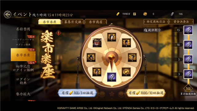 有償金を消費してルーレットを回すと、止まったマスに応じてゲーム内アイテムやSSR武将「上杉謙信・伝」を入手するための「上杉謙信・伝の募集片」が獲得できる。募集片を20枚集めると、SSR武将「上杉謙信・伝」を入手可能!SSR武将「上杉謙信・伝」は、この楽市楽座で初登場!ぜひこの機会に募集片を集めよう!