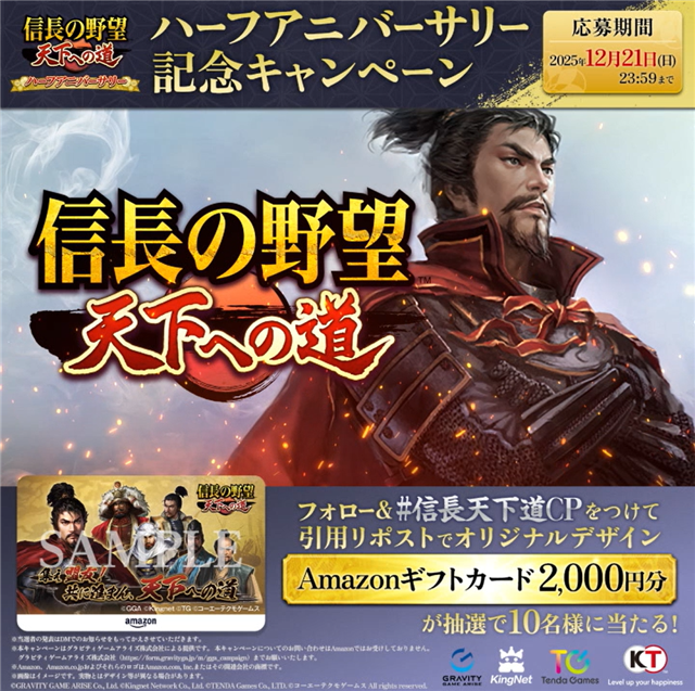 テンダゲームスは、コーエーテクモゲームスが著作権および知的財産権を保有する『信長の野望・天道』の正式ライセンスを受け、パブリッシャーをグラビティゲームアライズ、開発をテンダゲームスとKingnetで協力して進めている『信長の野望 天下への道』において、12月18日にリリースから半年を迎えることを記念して、イベントやキャンペーンを実施することを発表した。