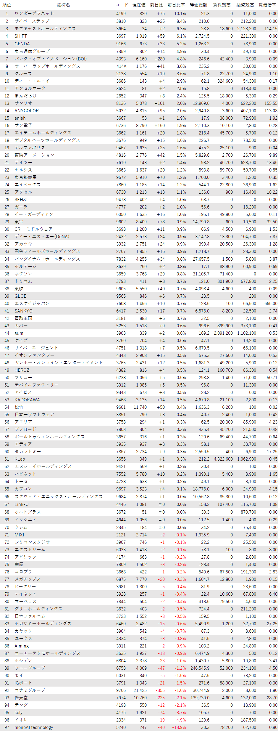 アニメやホビーなどその他コンテンツ関連銘柄は、タカラトミー<7867>、サンリオ<8136>、東宝<9602>、KADOKAWA<9468>、GENDA<9166>、東映アニメ<4816>、エディア<3935>、フリュー<6238>、ブシロード<7803>が高く、IGポート<3791>が安い。