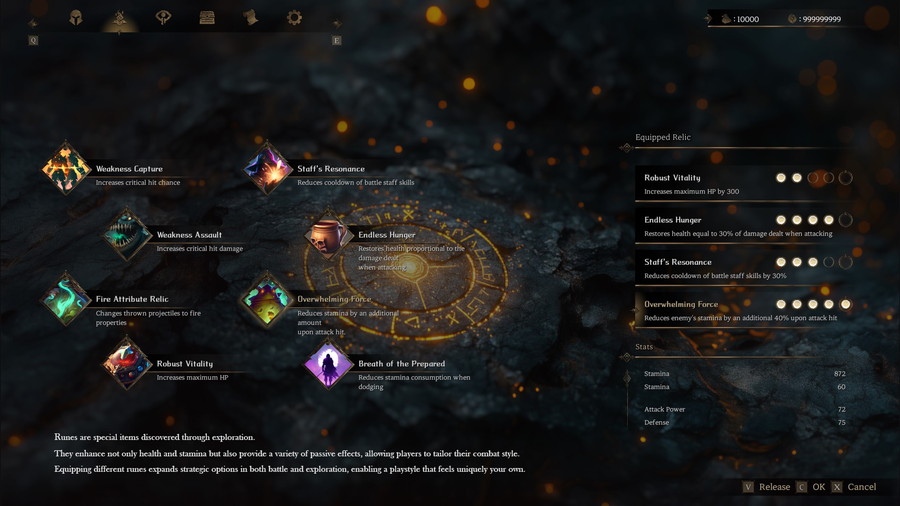 装備品は、伝説的な騎士が振るった最後の剣や一族が代々守り続けてきた盾など、固有の背景と物語を宿した「遺物」として描かれ、世界にひとつだけの存在である。成長システムにおいては、従来のキャラクターレベルの概念が存在せず、かつてこの世界に生きた者たちの感情や願いが込められた記憶の断片である<遺物(Relics/Runes)>を集めることで成長する。各Relicには70種類以上の固有パッシブ効果が存在し、戦闘スタイルに大きな影響を与える。成長は数値ではなく、この世界で積み重ねた経験によって形作られる。