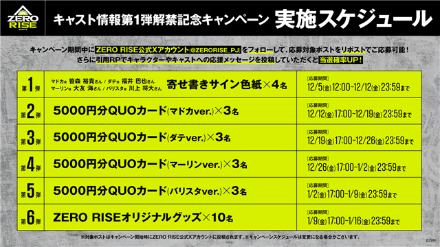 キャンペーン期間中にZERO RISE公式Xアカウント(https://x.com/ZERORISE_PJ)をフォローして、応募対象ポストをリポストで応募可能。リポスト対象となる投稿は12月19日17:00にZERO RISE公式Xアカウントに投稿する。さらに応募対象ポストを引用RPでキャラクターやキャストへの応援メッセージを投稿すると当選確率がUPする。