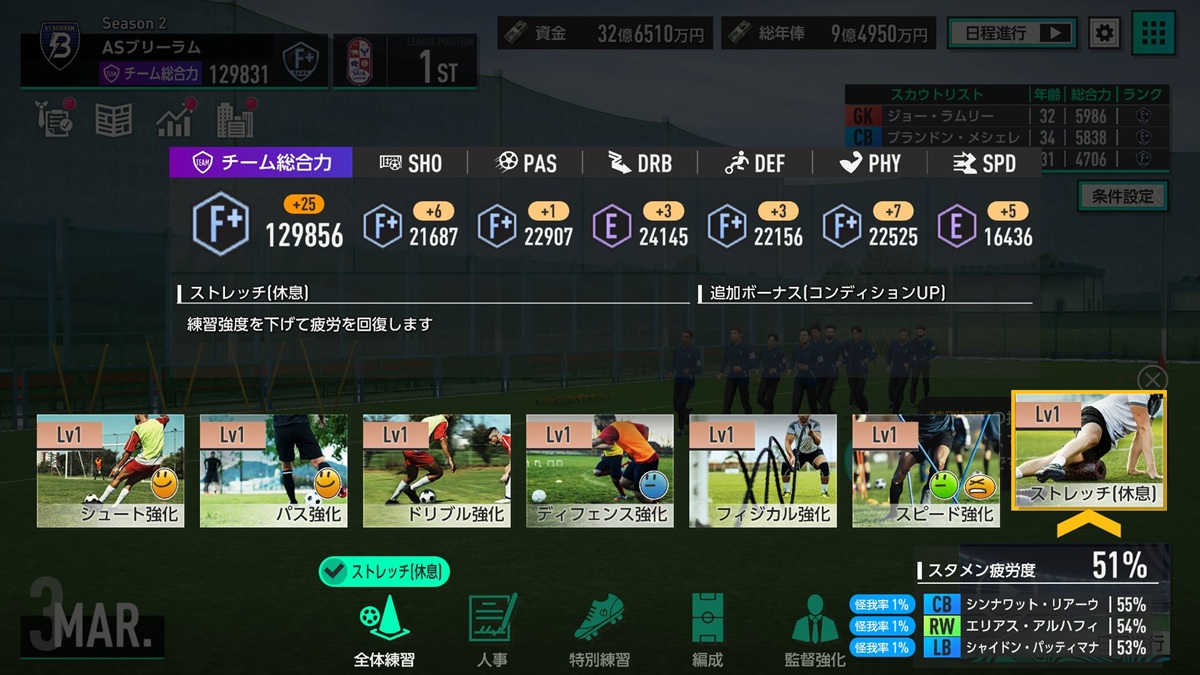 サカつくモードでは、月ごとにチーム全体の練習メニューを 指示することが可能だ。