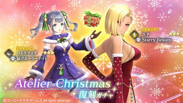 さらに、ガチャ「Atelier Christmas 復刻ガチャ」を開催いたします。ピックアップ対象キャラとして、★3 パトリツィア【届けホーリーナイト】、★3 ユナ【Starry Beauty】が登場するので、ぜひチェックしてみてください。