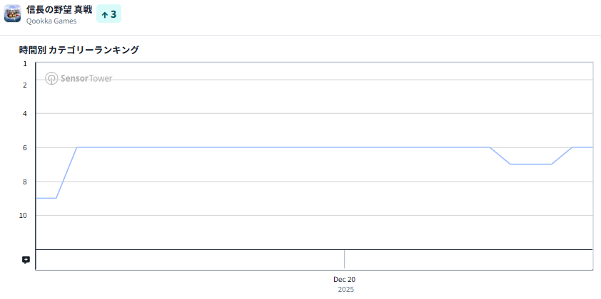 Qookka Gamesが昨日12月19日にリリースした新作『信長の野望 真戦』が好調な滑り出しを見せている。Sensor Tower(センサータワー)によると、App Storeセールスランキングではゲームカテゴリーで最高6位、全体でも12位まで順位を上げたとのこと。