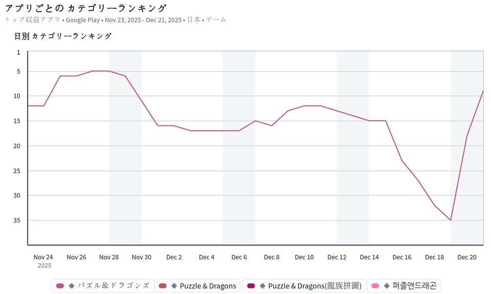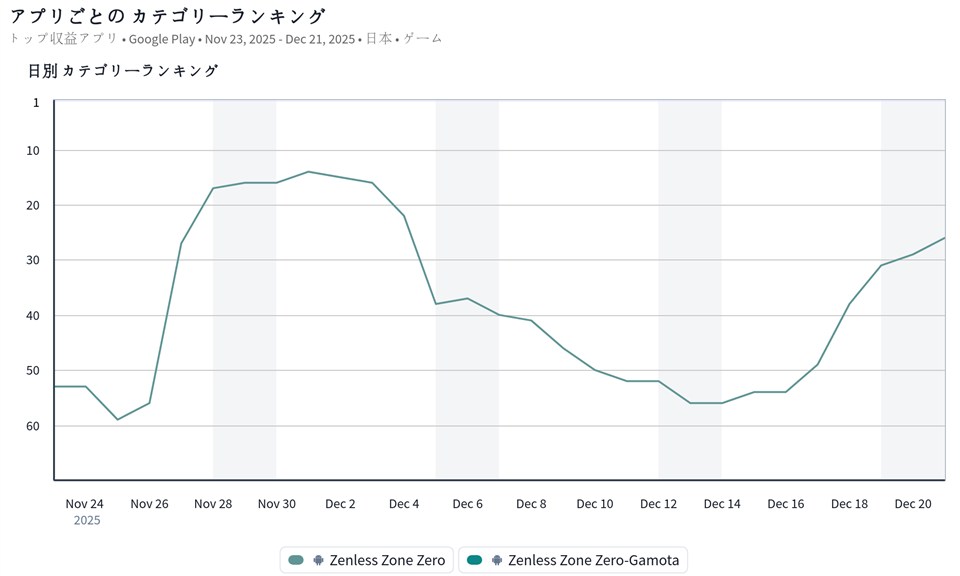また、HoYoverseの『ゼンレスゾーンゼロ』が26位とトップ30圏内に復帰した。『ゼンゼロ』は、限定S級エージェント「盤岳(炎・命破)」の変調受信確率がUPした独占チャンネル「焼くる心を篝火となす」を12月17日13時より開催していることなどが足元の売上につながっているもよう。
