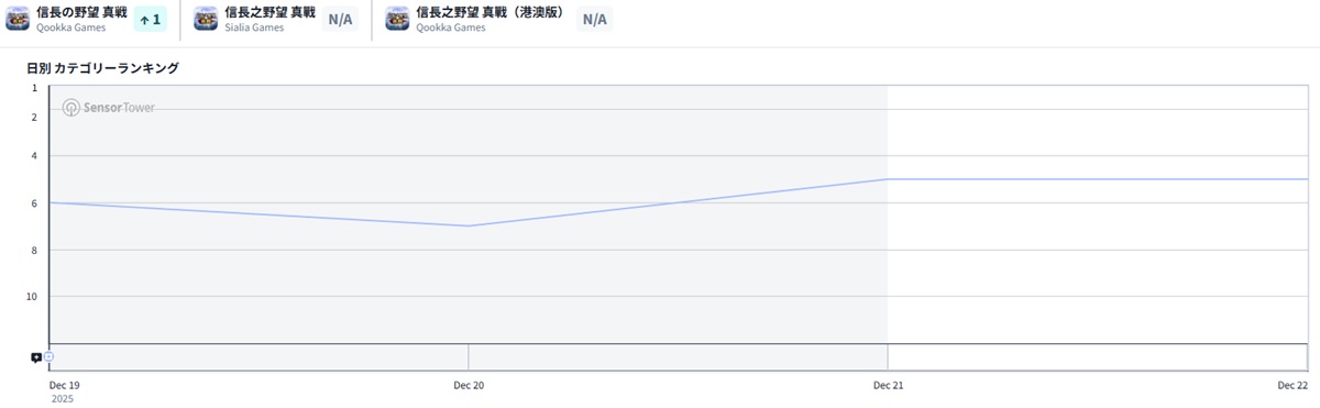 そしてこの日、Qookka Gamesが12月19日(金)より正式サービスを開始した『信長の野望 真戦』が5位にランクインした。