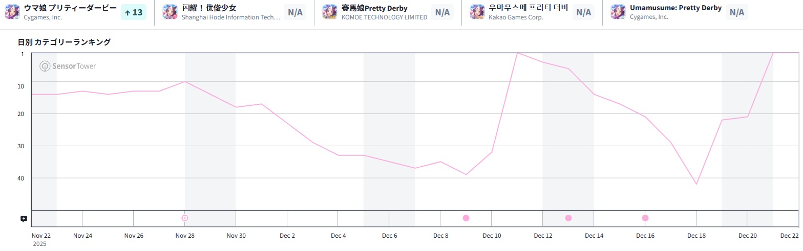 12月22日9時現在のApp Storeセールスランキング(ゲームカテゴリー)は、Cygamesの『ウマ娘 プリティーダービー』が41タイトルをごぼう抜きして首位に躍り出た。