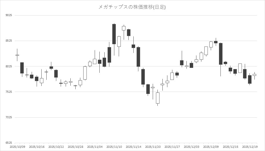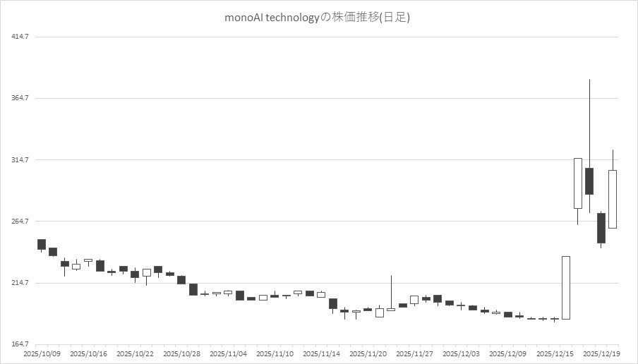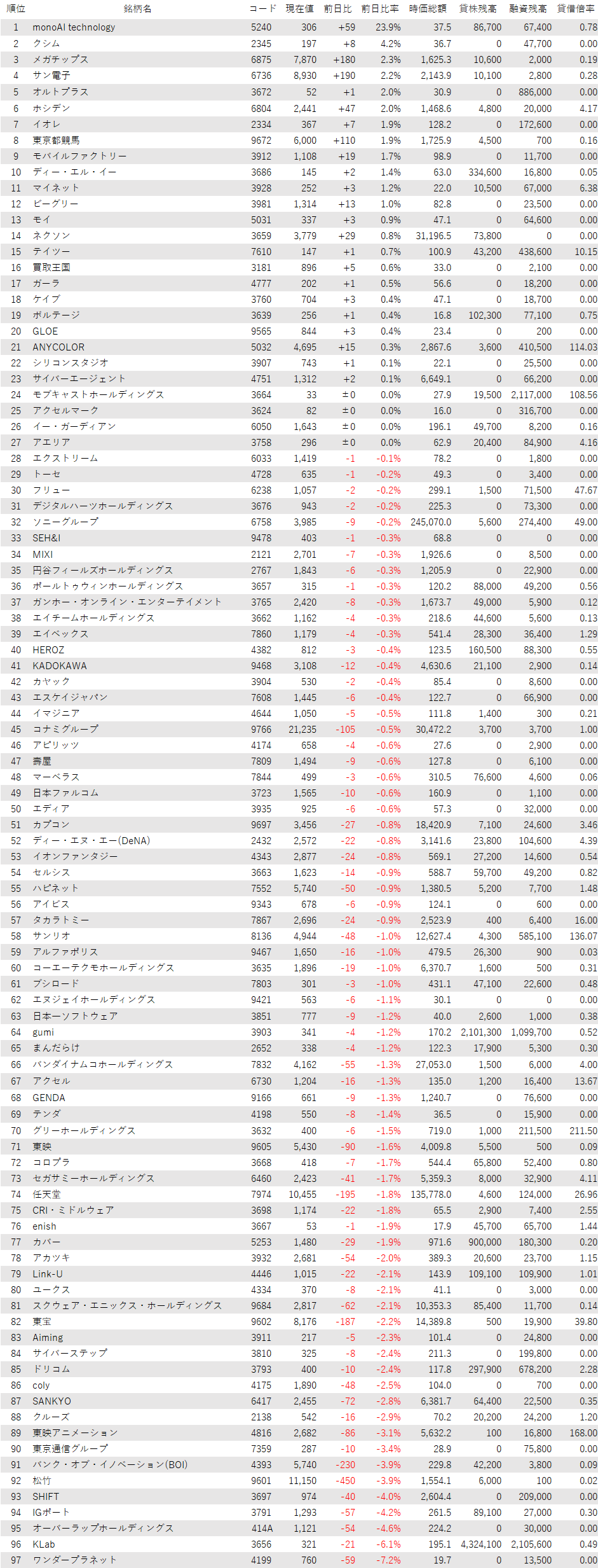 最後に騰落ランキングを見ると、monoAI technology<5240>やクシム<2345>、メガチップス<6875>、サン電子<6736>が値上がり率上位となり、ワンダープラネット<4199>、KLab<3656>、オーバーラップHD<414A>、IGポート<3791>が値下がり率上位となった。