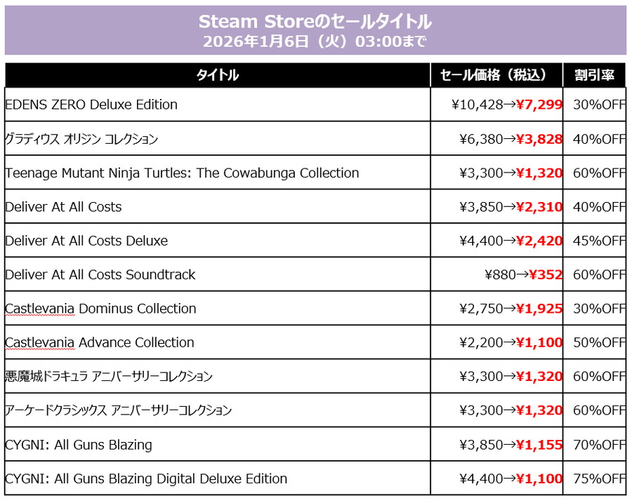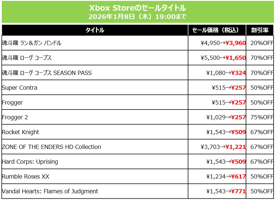 コナミデジタルエンタテインメント(KONAMI)は、ニンテンドーeショップ、PlayStation Store、Steam Store、Xbox Storeにおいて、ダウンロード版ゲームを最大80%オフで購入できる「HOLIDAY SALE」を開催している。年末年始の休暇をコナミのゲームで楽しむことができるセールとなっている。