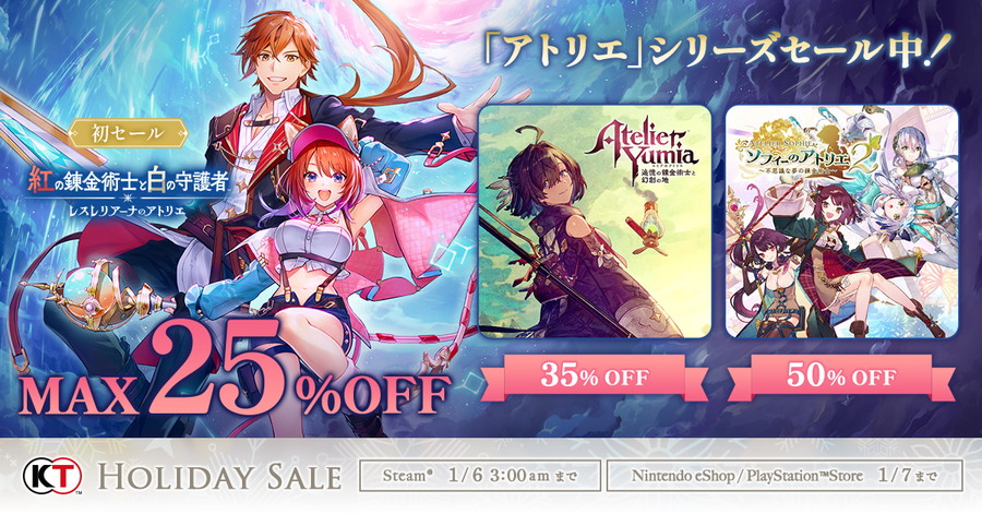 また、「アトリエ」シリーズのタイトルをお得に購入できる「コーエーテクモ Holiday Sale 2025」を開催している。『紅の錬金術士と白の守護者 ~レスレリアーナのアトリエ~』は初セールであり、『ユミアのアトリエ ~追憶の錬金術士と幻創の地~』は過去最大の割引率での提供となる。その他にも多数の「アトリエ」シリーズタイトルやダウンロードコンテンツが購入可能である。