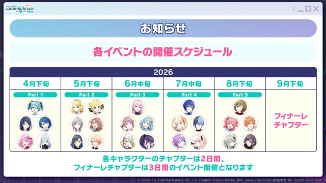 ★4メンバーのレアリティ別の提供割合が通常3%の2倍の6%となる「[2026新春]ブルームフェスティバルガチャ」を開催する。本ガチャでは、「ブルームフェスティバル限定メンバー」の日野森志歩、鳳えむの2名が新登場するほか、12月31日より開催予定の「新年言祝ぐ、祈りの舞」に新登場する、期間限定メンバーの花里みのり、青柳冬弥、鏡音リンも先行登場する。これらの新メンバーは同レアリティ内の他のメンバーよりも出現率が高くなっている。