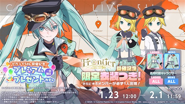 「プロジェクトセカイ COLORFUL LIVE 5th - Frontier -」東京公演の開催日となる2026年1月23日より、限定衣装付き「[セカライ5th 開催記念]プレミアムプレゼントガチャ」を実施する。限定衣装は、本イベントのキービジュアルを担当するおよさん(@ohyg3)によるデザインとなる。