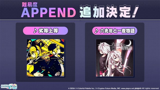 「劣等上等」(作詞:Reol、作曲:Giga)、「六兆年と一夜物語」(作詞・作曲:kemu)に、難易度「APPEND」の譜面が追加されることが決定した。