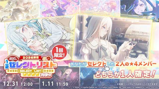 新春記念セールとして、クリスタルを期間限定でお得に販売する。さらに、豪華アイテムが入った「2026新春福袋」を4種類販売する。プロセカ公式ストアでのみ購入可能となるお得な「新春デラックスセット」も登場するので、ぜひご確認ください。