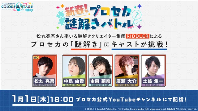 プロセカ公式YouTubeチャンネルにて、松丸亮吾さん率いる謎解きクリエイター集団「RIDDLER」が手掛ける『プロジェクトセカイ』の謎解きに、日野森志歩役の中島由貴さん、日野森雫役の本泉莉奈さん、天馬司役の廣瀬大介さん、神代類役の土岐隼一さんが挑戦する番組「新春! プロセカ謎解きバトル」の配信が決定した。お正月はぜひ『プロジェクトセカイ』の謎解きをお楽しみください!