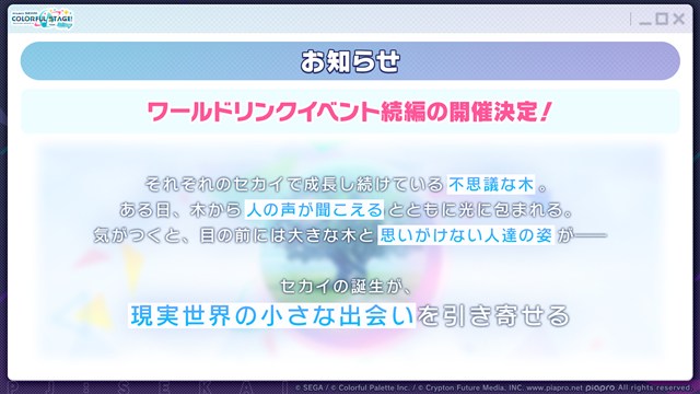 「ワールドリンクイベント」は、メンバーの“想いの変化”によりセカイの新たな“可能性”に立ち会う物語が楽しめるイベント。通常のイベントやチアフルイベントと異なり、時間経過によってイベントストーリーが解放され、イベントをサポートする「サポートユニット」が登場するなどの特別なイベントとなっている。次回のワールドリンクイベントでは、ユニットごとではなくシャッフルメンバーでの開催となるほか、各Partごとに書き下ろし楽曲が登場する。また、ワールドリンクイベントの開催に合わせて新登場するメンバーは、ヘアスタイル付きの「期間限定メンバー」を予定している。
