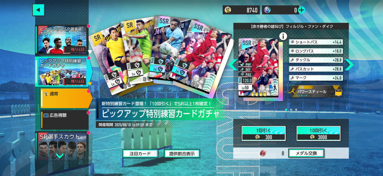 もう一つは、選手育成を効率化する「特別練習カード」を入手できる特別練習カードガチャ。