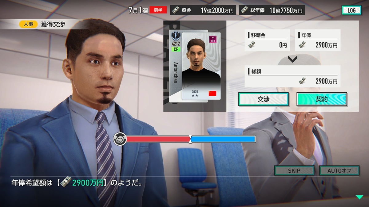 さらにクラブの戦力アップのために、スカウトで見つけた選手を獲得できる。こちらは希望通りの年俸を払って契約するか、交渉に持ち込むことが可能だ。