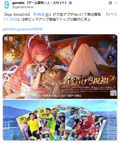 2月6日のApp Storeセールスランキング(ゲームカテゴリー)で、『サカつく2026』が前日25位から18位に浮上した。(関連記事)